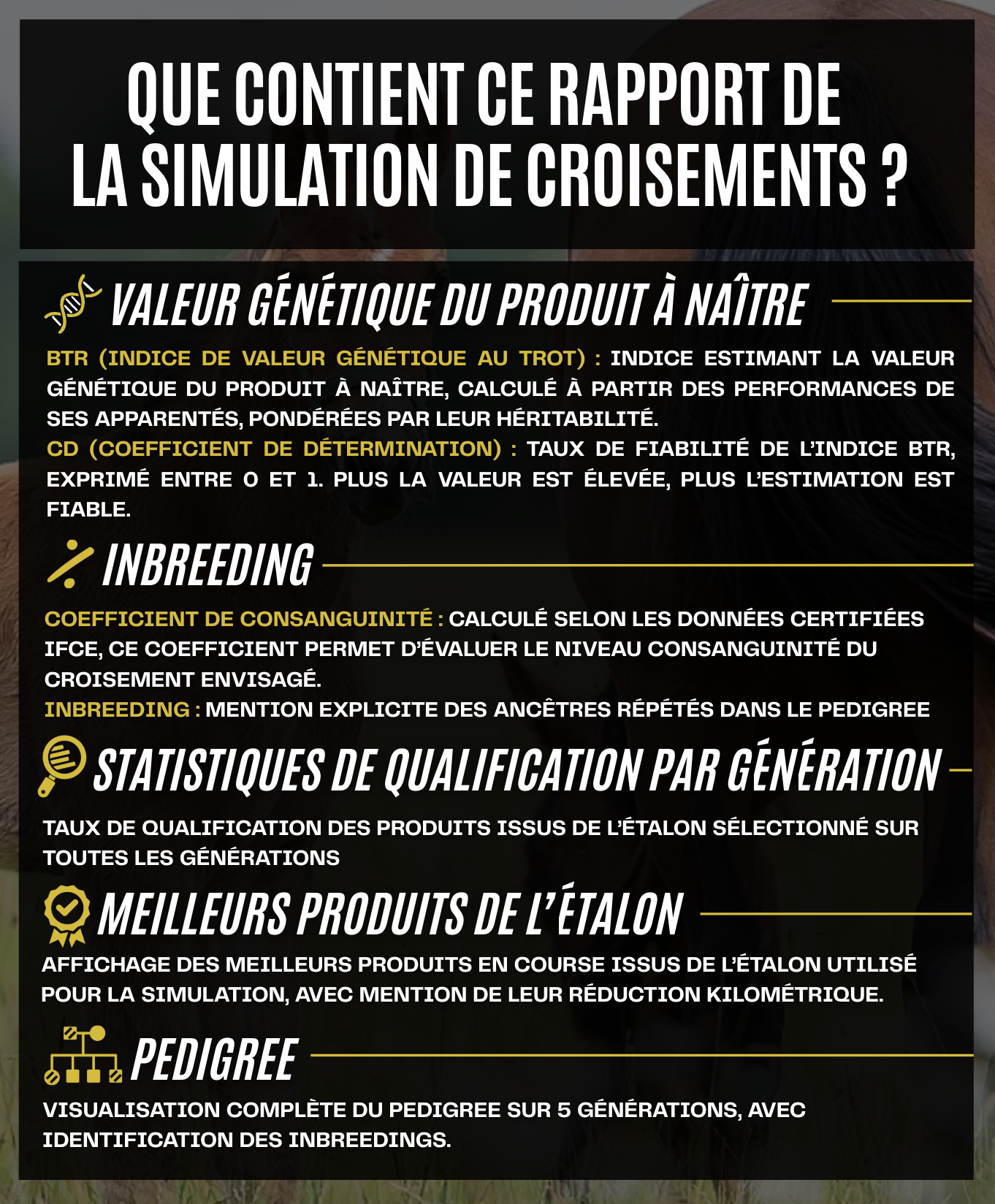 Nous avons le plaisir de vous présenter la nouvelle version enrichie de notre service de simulation de croisements. Cet outil repensé vous propose une analyse encore plus précise et complète pour optimiser vos décisions d'élevage.